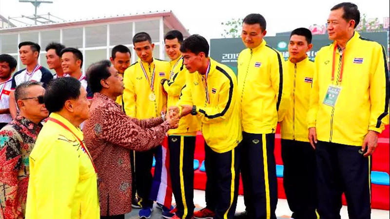 經(jīng)過4天的激烈角逐,最終泰國隊包攬了男子四人組、女子四人組、男子三人組、女子三人組冠軍,越南隊獲得男子三人組亞軍,中國二隊分別獲得女子四人組和女子三人組亞軍,男子四人組季軍為印尼隊和馬來西亞隊,男子三人組季軍為印尼隊和印度隊,女子四人組和三人組季軍均為中國一隊和印度隊。在頒獎儀式,上國際藤球聯(lián)合會秘書長、亞洲藤球聯(lián)合會主席拿督阿布都.哈利姆.卡德爾致辭,表示賽事舉辦得非常成功,并為賽事承辦單位及運營單位“青島西海岸新區(qū)教育和體育局”、“青島黃島發(fā)展(集團)有限公司”、“江蘇一鳴體育文化傳播有限公司”頒發(fā)了特別貢獻獎榮譽證書。